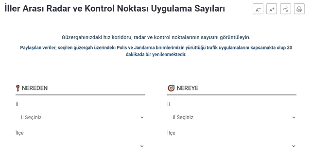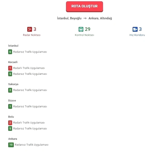Örneğin, İstanbul Beyoğlu'ndan Ankara Altındağ'a gitmek isteyen bir sürücü, 3 radar noktası, 29 kontrol noktası ve 3 hız koridorundan geçmektedir.